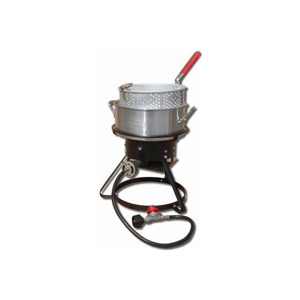 10 QT, 12, Outdoor Fish Fryer, Aluminum Fry Pan Punched Aluminum Basket, 4 Deep Fry Thermometer, 54,000 BTU Cast Burner, Listed LP Hose Regulator With Type 1 Connection, Bolt Together Cooker, Instruction Recipe Booklet, CSA Design Certified