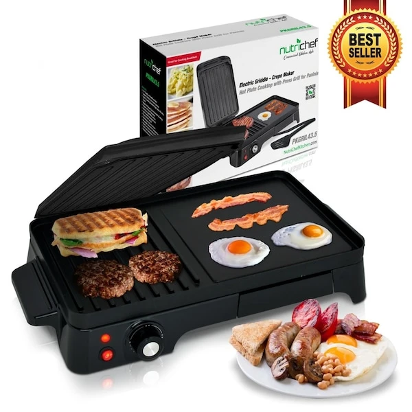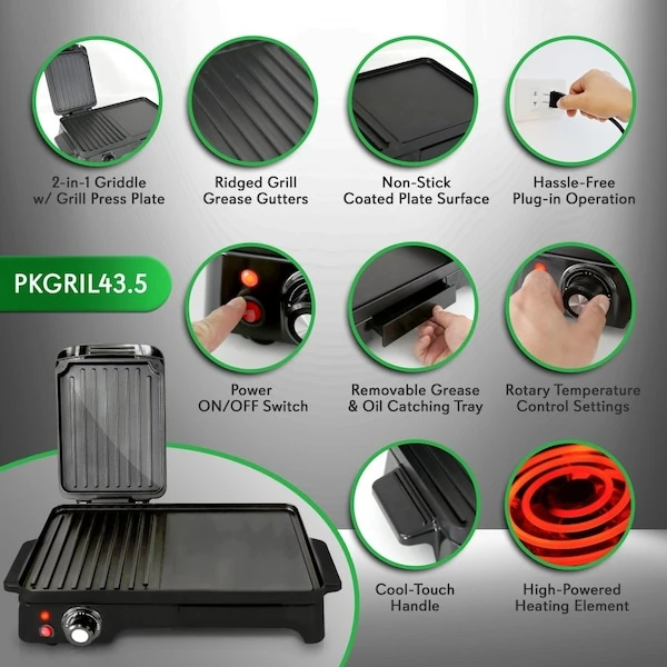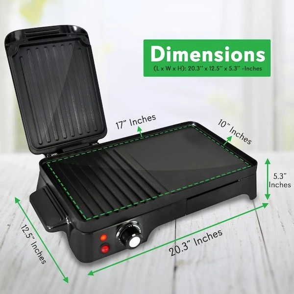 Features: – 2-in-1 Griddle with Grill Press Plate – Compact, Quick & Convenient Cooktop – Great for Cooking Breakfast Eggs, Bacon, Pancakes, Paninis – Ridged Grill Grease Gutters for Healthy Cooking – Hassle-Free Plug-in Operation – Non-Stick Coated Plate Surface – High-Powered Heating Element – Power ON/OFF Switch – Stain Resistant & Easy-to-Clean – Removable Grease & Oil Catching Tray – Rotary Temperature Control Settings – Cool-Touch Handle for Safe Food Handling – Perfect for Any Countertop, Tabletop, Kitchen Top What’s in the Box: – Griddle Plate Cooktop – Oil Catching Drip Tray – Spatula Tongs Technical Specs: – Heating Element Power: 1500 Watt – Total Griddle Plate Size (L x W): 17’’ x 10’’ -inches – Construction Materials: Die Cast Aluminum – Power Cable Length: 2.5′ Feet – Power: 120V – Dimensions (L x W x H): 20.3’’ x 12.5’’ x 5.3’’ -inches