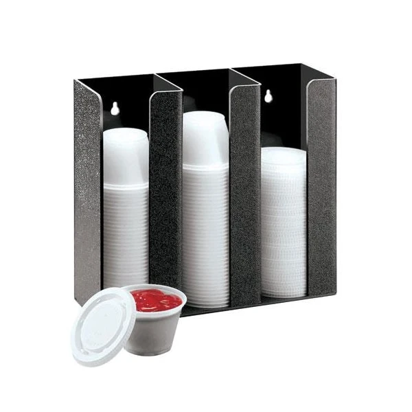 Classic lid/ramekin organizer; 3 slots will accommodate 2 in lids or ramekins; Black unit sits on counter or can be wall mounted (hardware included); 10 1/2 in (W) x 5 1/2 in (Depth) x 10 1/2 in (H)
