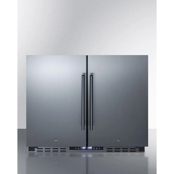 ADA compliant, commercially approved, frost-free, side-by-side refrigerator-freezer for built-in or freestanding use with two stainless steel doors, black cabinet, front-placed digital controls, and front locksSUMMIT brings quality and value under the counter with the industry€s largest collection of ADA compliant built-in refrigeration. The FFRF36ADA features a versatile design that meets NSF-7 and UL-471 commercial standards but is also approved for residential use. Sized at 36″ wide, this all-in-one, side-by-side refrigerator-freezer is designed for built-in or freestanding installation. This unit features stainless steel doors and a stainless steel kickplate for added elegance in any setting. The jet black cabinet simplified cleaning, while its white interior makes viewing interior contents easy and stainless steel handles complete the look. The sealed back simplifies cleanup and offers space savings, while its frost-free operation ensures minimal user maintenance. Each compartment has a factory-installed front lock for added security, as well as LED lighting to provide an attractive, energy-efficient presentation. Internal fans help to evenly cool each compartment. The user-friendly front digital display makes temperature control easy with a readout in either Fahrenheit or Celsius.Inside, the FFRF36ADA features a 2.9 cu.ft. frost-free freezer compartment on the left and a 2.9 cu.ft. frost-free refrigerator compartment on the right. The refrigerator compartment includes three adjustable glass shelves with five placement options that offer multiple spill-proof storage options. The freezer compartment includes three adjustable chrome shelves, with five placement options for optimal storage options and proper cold air circulation. The freezer compartment includes three adjustable chrome shelves for proper cold air circulation. Additionally, the freezer section can be converted to run as a refrigerator, allowing you to adjust the temperature range to best accommodate your storage needs at the touch of a button. The FFRF36ADA is sized at 31 1/2 inches high to fit under lower ADA compliant counters. For this unit with panel ready doors, see the FFRF36IFADA. NOTE: Due to its larger commercial design, the FFRF36ADA requires an additional 5/8″ of width for each door to open to a full 90o. If placing this unit against a right angle wall, be sure to accommodate this extra space. 31 1/2 height allows for installation within ADA-complian