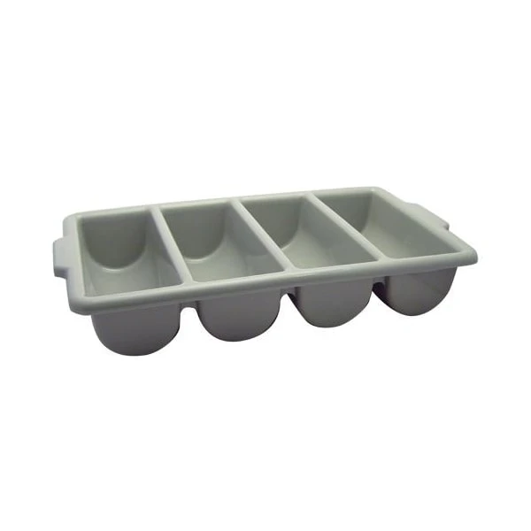 4 compartment cutlery holder; 21 1/9 in (L) x 12 4/5 in (W) x 3 8/9 in (H); Gray plastic construction; Heavy duty; NSF certified