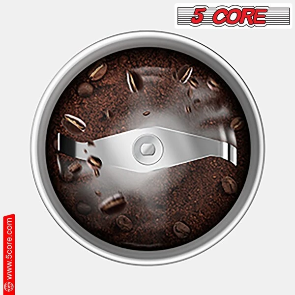 DESCRIPTIONCompact Design There’s no wasted space with this grinder. The compact design takes up minimal space on your countertop, and the cord wrap makes storage organized and easy. Lid-Locking Safety Feature No spills, no accidents. The integrated safety mechanism allows the blades to turn on only when the lid is securely locked. Cord Storage Clutter-free storage thanks to the integrated cord wrap. Pulse Control Easily stop and start the blades to get the exact results you’re looking for Grind Spices, Herbs, Grains, and Nuts Coffee beans are just the start. This versatile grinder easily chops and grinds spices, herbs, grains, nuts, and more. Coffee Grinder, One Touch Push-Button Control, Stainless Steel Grind whole beans for your favorite brewed coffee with the 5 Core Coffee Grinder. The stainless steel blades and bowl deliver 30% better grinding to deliver a uniform grind. Plus, this large-capacity grinder features one touch push-button control so you can quickly create the perfect consistency. It’s also great for grinding herbs, spices, and grains, or chopping nuts and seeds. Product Dimensions LxWxH: 4.5×4.5×7.5 in Weight: 1 lb 7.2 oz Package Dimensions LxWxH: 5x5x9 in Weight: 1lb 13.3 oz