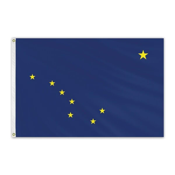 Unsurpassed in beauty and craftsmanship, these nylon outdoor flags are manufactured to precise specifications. Expertly crafted using 100% heavyweight, 200-denier nylon bunting, and treated to resist sun and chemical deterioration. Extremely durable and fast drying, nylon flags are the most popular choice for outdoor flags. All nylon flags are finished with a strong, durable snow-white header and brass grommets. The Alaska state flag was adopted on July 9th, 1927 and is unique in that seven of its eight gold stars form the “Big Dipper”, and the last star is enlarged and represents the North Star.