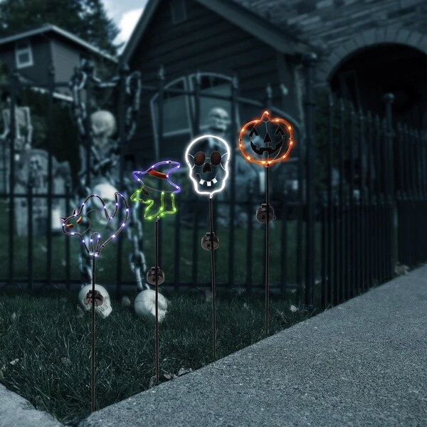 Add some scary fun to your outdoor space with Alpine Corporation’s Solar Halloween Icon Garden Stakes with LED Lights! Select from a pumpkin witch skull or cat or use all five to create a frightful display. The cool white solar LED lights illuminate the designs to provide an eye-catching accent day and night. Constructed of metal and plastic this festive accent will provide years of decorative Halloween flair. The solar-powered stake has a battery life that operates for 6-8 hours on a full solar charge and also includes an on/off switch. Easily set up this garden decor using the durable stakes that firmly plant into the ground. At around 3 ft. tall each garden stake measures 7L x 1W x 36H (Witch); 8L x 1W x 36H (Cat) 7L x 1W x 35H (Pumpkin) and 6L x 1W x 36H (Skull) and include a one-year manufacturer’s warranty from date of purchase.