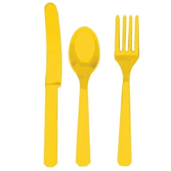 Eat in style with this 24-Piece yellow sunshine plastic cutlery.Includes 8 forks 8 knives and 8 spoons.Material: Plastic.