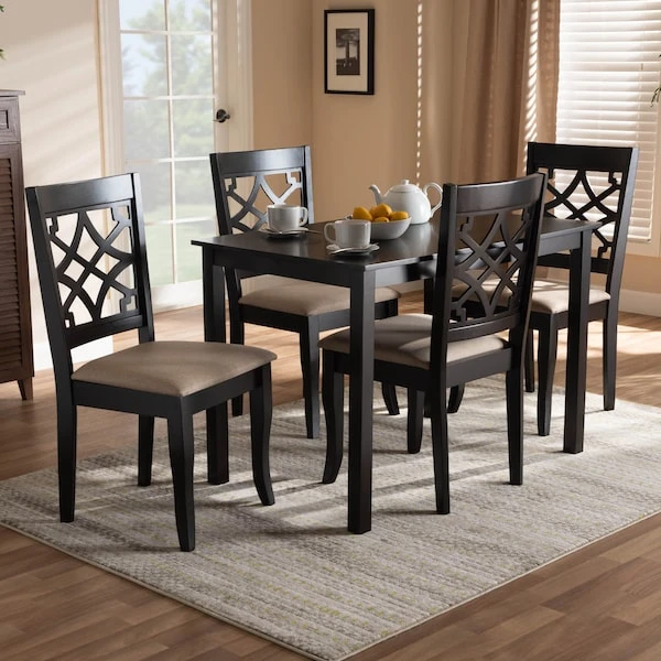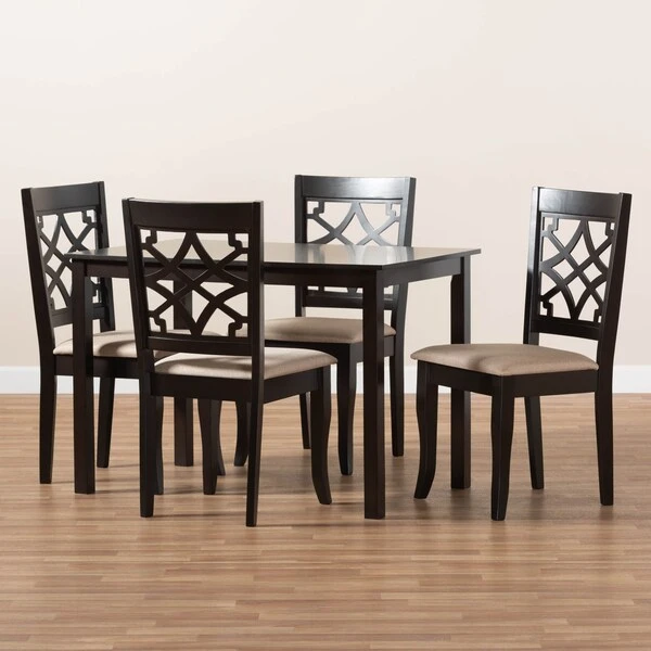 Cultivate an air of elegance in your dining room with the Mael 5-piece dining set. Constructed from solid oak wood, this dining set includes one table and four chairs, each upholstered in a light polyester fabric that complements the rich espresso wood finish. Designed with both comfort and style in mind, each chair features a plush foam-padded seat, as well as an exquisite cut-out design on its back. Saber legs add a classic, refined touch. Equally suitable for both chic dinner parties and casual family dinners, the Mael dining set is sure to enhance any dining experience. The Mael 5-piece dining set requires assembly.