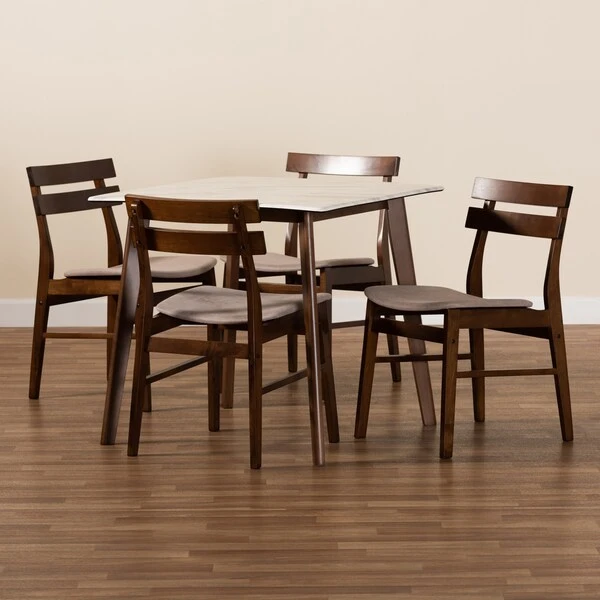 Anchor your dining space with the mid-century modern style of the Richmond dining set. Made in Malaysia, the Richmond is constructed from durable wood and includes one dining table and four dining chairs. Each chair is foam padded and upholstered in a graceful light-tone fabric that complements the walnut brown finish on the wood. Slatted wood backrests provide excellent back support while allowing light to flow more freely throughout the room. Requiring assembly, the faux marble tabletop gives a luxurious feel, while splayed legs provide ample leg room for each member of the table. With its compact size, the Richmond dining set is well suited for dining rooms and nooks with limited space.