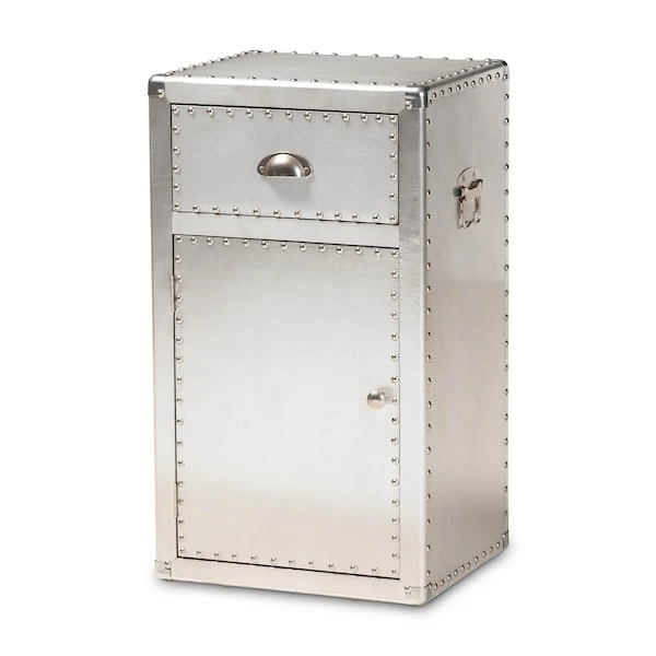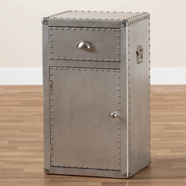 Bring chic industrial style into your space with the Serge cabinet. Constructed from metal, the Serge features one drawer and one concealed compartment, behind a door, to keep items organized and out of sight. Polished silver metal drawer handles add a sleek touch. Inspired by vintage storage trunks, the Serge is embellished with rivets and corner protectors. Use this piece as a nightstand in the bedroom or as an accent piece in the living room. The Serge cabinet will arrive fully assembled.