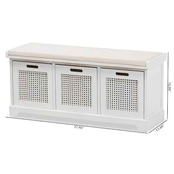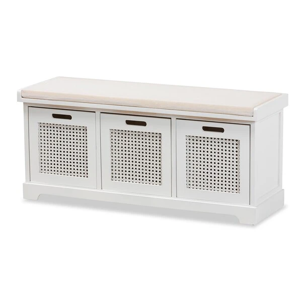Add an elegant touch to your entryway with the fantastic Tabor storage bench. Made in China, this bench is comprised of a sturdy wood frame accented with rattan. Its plush seat is padded with layers of foam and upholstered in smooth fabric for superb comfort as you prepare for the day. Comes fully assembled, the Tabor features three storage baskets adorned with woven rattan for a light, airy feel. An efficient yet graceful addition, the Tabor storage bench transforms the modern entryway.This is a product of nature and may have variations in areas such as, but not limited to, color, pattern, grain and texture. The hair-like strands of rattan/rattan-fiber are common due to nature of the material.