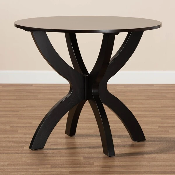 Smooth curves and a sleek finish define the Tilde dining table. The Tilde dining table is built from sturdy wood and comfortably seats up to four. A dark brown finish and round tabletop give the table a contemporary look while also providing ample elbow room for each member of the table. The tabletop is supported by an intersecting base, creating a chic, sculptural effect. Requiring assembly, the Tilde dining table is well suited for both casual and formal dining.