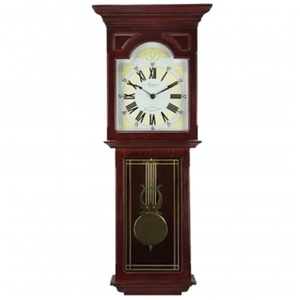 - A dark redwood oak finish and gold-tone pendulum give this clock refined elegance