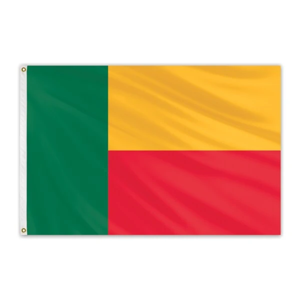 Unsurpassed in beauty and craftsmanship, these nylon outdoor flags are manufactured to precise specifications. Expertly crafted using 100% heavyweight, 200-denier nylon bunting, and treated to resist sun and chemical deterioration. Extremely durable and fast drying, nylon flags are the most popular choice for outdoor flags. All nylon flags are finished with a strong, durable snow-white header and brass grommets. The Benin flag is a horizontal bicolor of yellow and red with a green vertical band a the hoist. This flag was adopted on November 16th, 1959.