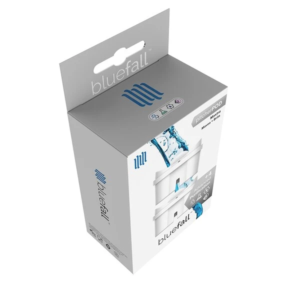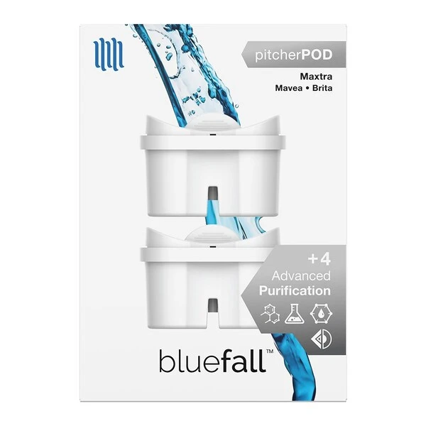 So it’s time to replace your pitcher’s water filter. If you’re looking for premium OEM quality without paying double for the logo on the label, this filter is for you. All Bluefall PitcherPod filters feature the Drinkpod +4 Advanced Purification process. Our filters are manufactured to be lead free, with natural coconut-based carbon media, and BPA-free housings, in an ISO9001 facility. PURIFICATION: Our +4 Advanced Purification process has been optimized for your Mavea, Brita, or Bosch pitcher or appliance to improve your drinking water in four specific ways. Through the use of mechanical reduction, the particle scrub utilizes the filter media’s fine micro-mesh structure to trap particles. Effective for reducing large particles of contaminants like cysts, rust, and other sediments. A chemical reduction process that uses the carbon granules oleophilic surface to attract organic compounds and non-polar contaminants, which they ADSORB onto their surfaces. Effective for reducing THMs, organic contaminants like chlorinated solvents, pesticides, and other industrial pollutants. The polishing scrub utilizes pressure to force-diffuse your water throughout the filter’s vast micro-pore mesh, reducing dangerous and aesthetic contaminants. The filter media of a single cartridge can have a surface area that exceeds 50 thousand square feet. Effective for improving the safety of your drinking water while greatly reducing undesirable taste, odor, and color. Finally, an ion exchange process that utilizes a ‘resin’ of hundreds of porous polymer beads inside the carbon bed. These beads contain electrically charged atoms, known as ions, in two forms – positive and negative. During the ion exchange process, the beads exchange their harmless ions for similar ions of unwanted contaminants that cause water hardness (like magnesium and calcium), leaving the contaminants ‘stuck’ to the fixed ions within the beads. COMPATIBILITY: Brita/Mavea/Bosch: Maxtra • 105731 • 1001122 • 106832 • 1001495