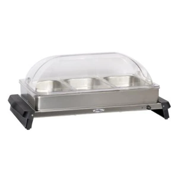 Keep prepared food hot and ready to serve with BroilKing`s electric Rolltop Buffet Server. Comes with a convenient roll top lid that allows your guests to view the food you ve prepared and easily roll back the lid when they re ready to serve themselves. Stainless warming tray base is equipped with an adjustable thermostat that ranges from 155 to 205 degrees Includes three 2.6 quart pans and 1 pans frame both of which are removable Equipped with safety signal on light 4 non-skid feet and cool-touch handles 2.6 quart pans hold up to 25 four ounce servings each
