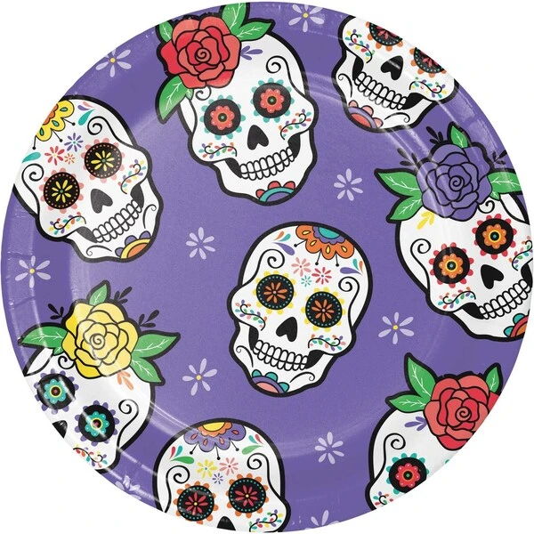 Your favorite candy and treats will taste sweeter when served on the colorful Día de Muertos Dessert Plates. These sturdy paper plates measure 7” and feature skulls with a green, blue, and black theme. Sold in packs of 96, these disposable paper plates coordinate with all Día de Muertos party supplies. Perfect for a festive Halloween party.
