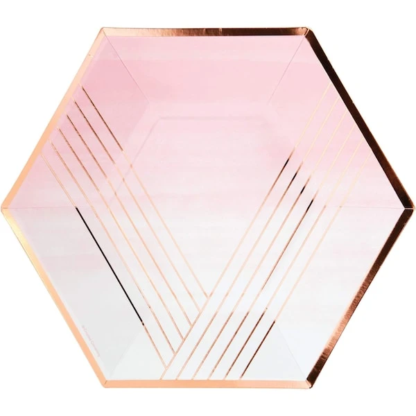 Your guests will realize what an incredible party they are attending when you use the elegant, contemporary Rosé All Day Paper Banquet Plates. These sturdy 11.5” hexagon-shaped plates feature a pink theme and rose gold foil stripes. Sold in quantities of 96, these disposable paper plates coordinate with all Rosé All Day party supplies.