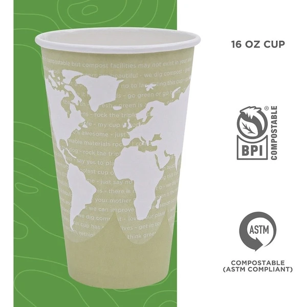 Hot drink cups offer a PLA inner lining to ensure a leakproof seal without the use of conventional plastic. Lining is made of a plant-based resin. Smooth rolled rim ensures comfortable use and a secure lid fit. The exterior design features a map of the world with the land masses in white. Cups are made from renewable resources including paper and with an inner lining made with a natural plastic made from corn. Paper hot cups are not recommended for microwaves.