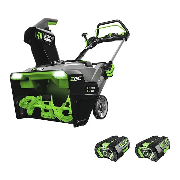 Snow Blower, 21 in Clearing Path, Auger Diameter 7 in, Inlet Height 13 in, Battery Operated Torque, Battery Type Lithium-Ion, Voltage 56 V, Amps 5 Ah, Displacement 40 ft, Drive Type Auger, Stages 1, Start Type Electric, Number of Batteries 2, Wheel Dia. 7 in, Auger Type Steel, Chute Rotation Remote, Chute Turning Radius 180 Degrees , Lights Yes