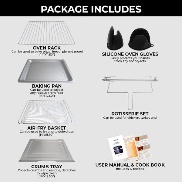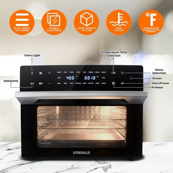 Our Emerald 30 Liter digital Air Fryer Oven is the future of your kitchen, combining many different appliances into one You can easily set your cooking time and temperatures with our simple operation system The wide range of cooking functions allow for
