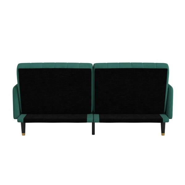 Bring elegance and sophistication into your home with the vintage silhouette of this mid-century modern split back futon sofa featuring soft velvet upholstery with vertical stitching. Compact and multi-functional, the split back design allows each side to be independently adjusted from upright, to reclining, and finally laying flat. If you missed the angle you wanted, simply pull the back completely forward and lay flat to start again. Generously padded, this convertible futon sofa will cradle your body and relieve pressure points while you sit or sleep. Sturdily built with solid wood legs, a wooden frame, and center support legs, this futon sofa holds up to 600 lbs. static weight capacity. Sinuous springs in the seat give an extra supportive feel while the fixed back and seat cushions keep your space neat and tidy. Expertly packaged in 1 box, this sleeper couch arrives with the tools and illustrated instructions included for 10 minute or less assembly and cleanup is easily achieved with a damp cloth.