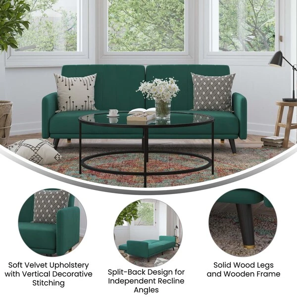 Emerald Velvet Split Back Futon Sofa – Wooden Legs