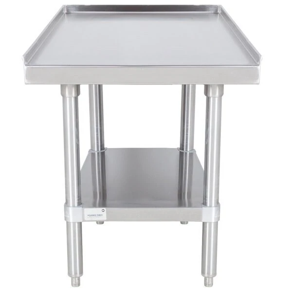 The heavy duty Advance Tabco ES-302 30in x 24in stainless steel equipment stand with stainless steel undershelf is built to stand tough in the busiest commercial kitchens! It has a rugged 14 gauge type 304 stainless steel top with a 1in hemmed splash on the rear and sides and a v-edge front that helps contain spills. This durable 30in x 24in equipment stand features stainless steel legs with matching bullet feet and an adjustable stainless steel undershelf for optimum strength and flexibility.Overall Dimensions:Length: 24inWidth: 30inHeight: 25inWork Surface Height: 24inBacksplash Height: 1in