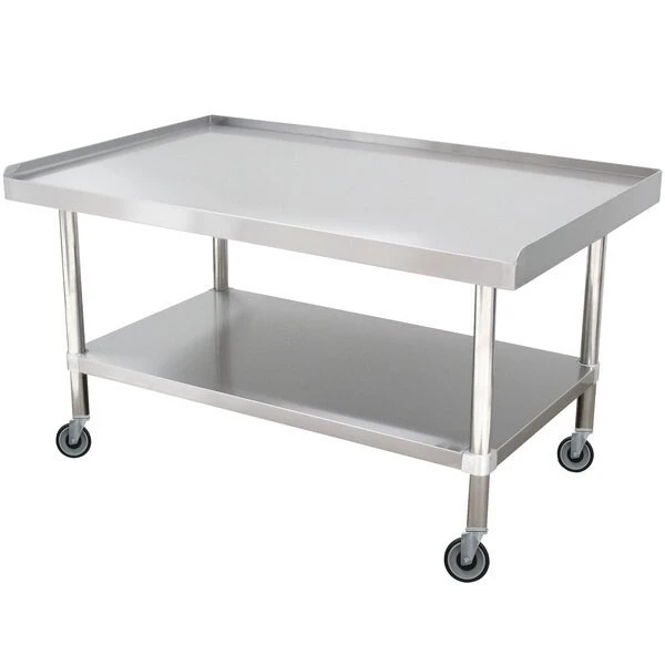 Organize your kitchen with the help of this Advance Tabco ES-306C 30in x 72in stainless steel equipment stand. Boasting a durable 14-gauge type 304 stainless steel top and a sturdy 18-gauge undershelf this equipment stand is designed to withstand the demands of a busy commercial kitchen. The top features a satin finish for a professional look and it’s sound deadened to minimize noise in the kitchen. The undershelf is adjustable and provides additional storage space to keep ingredients and kitchen tools up off the floor for a sanitary work environment.With the ability to hold up to 1000 lb. this equipment stand is perfect for holding countertop mixers meat grinders and vegetable slicers. To help keep tools and equipment from sliding off this stand has a 1in hemmed splash on the rear and sides. Plus the die cast leg clamps create added stability for long-lasting use. For added convenience the 5in casters provide easy mobility so you can create a work station wherever you need it most!Overall Dimensions:Length: 72inWidth: 30inHeight: 25inWork Surface Height: 24inBacksplash Height: 1in