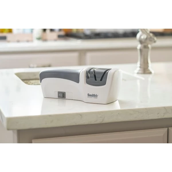 Warning: You must be 18 years of age or older to purchase a knife.The Compact Electric Knife Sharpener features electric and manual sharpening in one ergonomically designed, compact unit. The electric sharpening slots feature a synthetic sharpening wheel with blade guides to automatically hold your knife at the correct sharpening angle. The crossed ceramic rods in the manual slot are then used for finishing or for maintaining an already sharp blade. Use for sharpening straight edge European/American style knives.