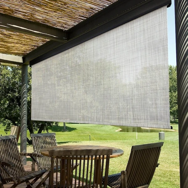 Exterior Sun Shade, Mounting Location Wall, Ceiling, Operation Type Pole and Crank, Material PVC Coated Polyester Yarn, Fabric Color Kona, UV Protection 90 Percent, Blackout No, Overall Width 96 in, Fabric Width 93 3/8 in, Fabric Drop 96 in, Valance Included Yes, Valance Color Oil Rubbed Bronze, Valance Height 3 1/4 in, Operation Side Right/Left, Valance Depth 2 7/8 in, Tie Down Type Bungee and Hook System, Assembly Required No, Standards Greenguard, Oeko-Tex, NFPA