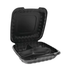 Microwavable Hinged Lid Containers, 3 Comp, 9.33×8.88×3.1, Blk, PK120