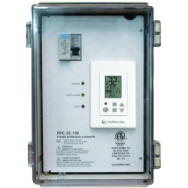 PYRO FPC is a “Plug and Play” Freeze Protection Controller and a Power panel for frost protection, Heat tracing, ice and snow melting applications. When the temperature drops below the pre-defined, adjustable set-points, the contactor is activated energizing the heating elements. The Technician Settings mode enables an installer, or a technician to adjust the parameters for customized installations using the electronic controller installed in the front panel.Up To 30A & 120/240V Outputs To The HeatersHold-On (Time delay) Adjustable Range Of Up To 99 hoursTemperature input from the provided temperature sensor (10 m. / 30 feet long) and also from a 3rd party aquastatIntegrated Electronic Controller with Backlit LCD DisplayIntegral 30mA GFEP allows manual reset from the front panelAdjustable Set-points, Hold ON/OFF Time delay and manual ON durationManual and Automatic modes, selected by a buttonTesting/commissioning mode for easy and fast system test, all year long (even during summer or at high temperature condition)Multiple Sensors Input-OptionalETL Certified for USA and Canada