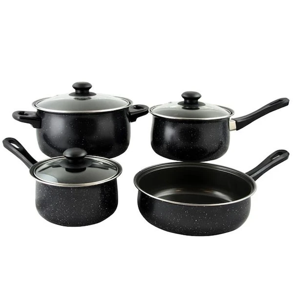 The Gibson Home Casselman 7 Piece Cookware set features an enamel look with a black finish. The set features a non-stick interior. This set is carbon steel constructed, has Bakelite heat-resistant handles, glass lids and a unique speckle exterior finish. Hand wash only.