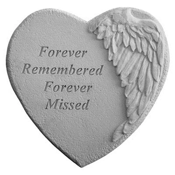 Kay Berry products are made of cast stone in Saxonburg PA. They are made to be weatherproof and guaranteed to last a lifetime. All of the decorative stones have a hangar cast into the backs to allow display on walls, fences, or outbuildings.This memorial stone has a decorative angel wing accent along with a beautiful memorial message. This memorial stone offers a permanent and touching way to honor a loved one. The beautiful design wings rise above the surface of the stone.Can be placed in the ground in a garden, etc.Has a hanger cast into the back to allow display on walls and fences.Crafted of cast stone for a rich texture and year round durability.Has the look, feel and weight of true stone.Weatherproof and guaranteed to last a lifetime.Message: Forever Remembered Forever Missed.Made in USA.Dimensions: 9″ x 9″.