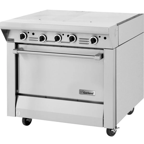 An outstanding combination of holding and cooking potential the Garland M46R Master series natural gas 2 section even heat hot top range is the ideal workhorse for any busy commercial kitchen. For the best in simmering holding and more this heavy-duty model comes w two 17in hot tops w three 30000 BTU inHin burners that can even provide enough consistent heat for stock pot cooking. Its flat seamless design also makes it easy to slide heavy stock pots from the cooking area to holding. It features a spacious 40000 BTU oven w a fully porcelainized interior for optimum output and easy cleanup. As part of Garland’s heavy-duty Master series this powerful range provides exceptional heating for faster cooking times that save you money!The Garland M46R includes a generous 7 1/2in stainless steel front rail that provides a flat and sturdy surface for a variety of kitchen necessities. It boasts a stainless steel front and sides that make it both incredibly durable and extremely easy to clean and maintain.The Garland M46R Master series 2 section 34in even heat hot top range is mounted on 6in legs to keep it well off the floor and easy to clean underneath.Overall Dimensions:Left to Right: 34inFront to Back: 38inHeight: 36 3/8inOven Dimensions:Left to Right: 26 1/4inFront to Back: 29inHeight: 13 1/2in