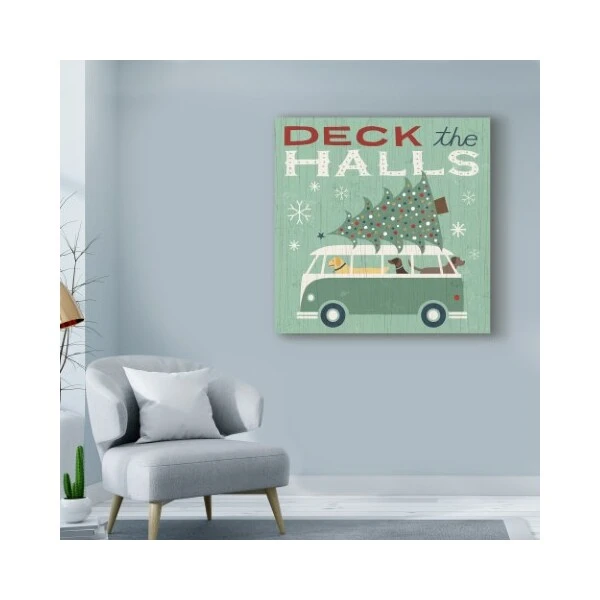This ready to hang, gallery-wrapped art piece features the words “Deck the Halls” in red, blue, and white letters above a teal VW Bus full of dogs hauling a Christmas tree on the roof.