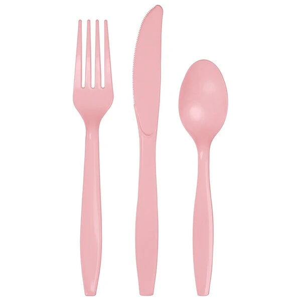 Give your guests a premium dining experience that matches your party color atmosphere with the Classic Pink Cutlery Assortment. This elegant cutlery set comes with 8 forks, 8 spoons, and 8 knives. Sold in packages of 288, these heavyweight plastic utensils will bring a unique touch to your table setting.