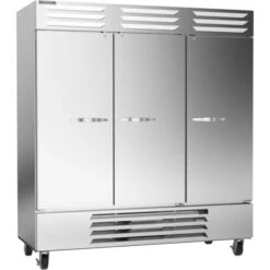Refrigerator, Reach-in, Three Section, 68.93 cu. ft.,Electronic Control, (3) Lockable Hinged Self Closing Solid Doors, (9) Wire Shelves, LED Lighting, Gray Painted Interior, Stainless Steel Front, Gray Coated Steel Sides, Bottom Mounted Self Contained Refrigeration, R290 Hydrocarbon Refrigerant, 1/2 HP Compressor, cULus, UL EPH Classified, UL-Sanitation
