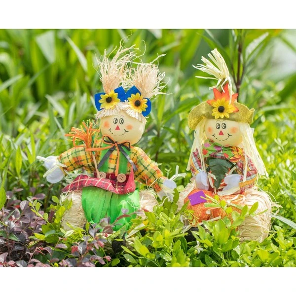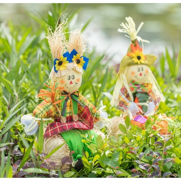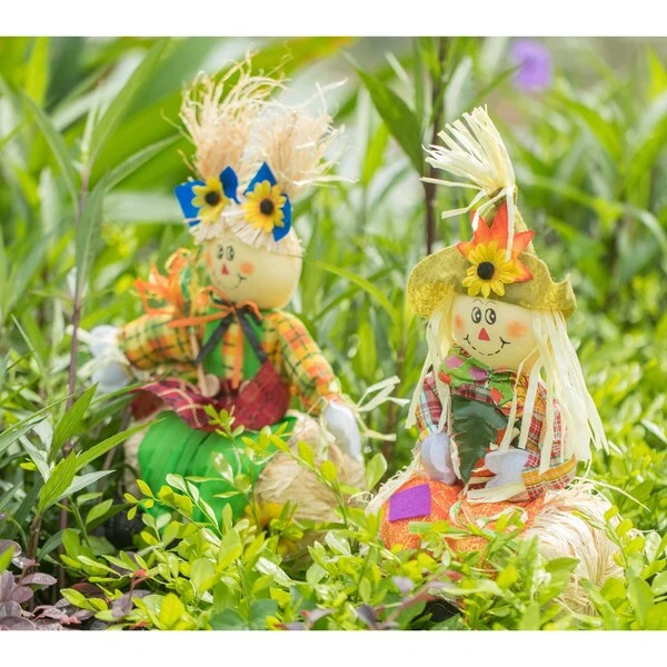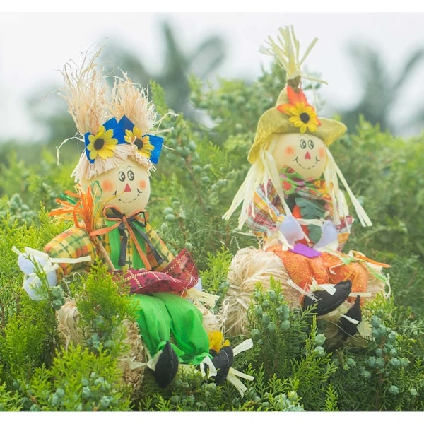 Sitting on a hay bale and clutching pumpkins and a witch’s besom broom, this stuffable scarecrow set is the perfect way to decorate Fall with vibrant autumn colors and patterns! Pose the figure on your porch or front yard for a festive harvest theme. These scarecrows will scare away unwanted garden guest but will decorate your garden in a fun fall theme all season long.