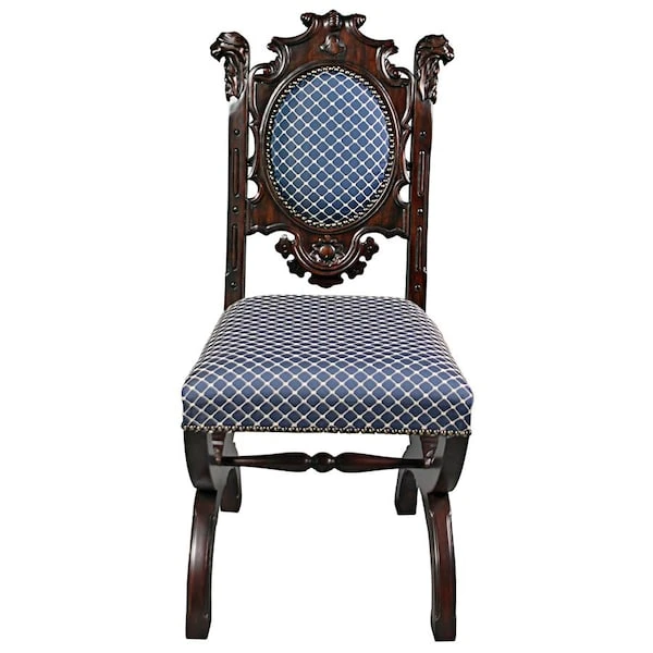 From the exquisitely carved heraldic lion heads flanking the scrolled tops, to the upholstered Medieval medallion backs, these dining chairs are sure to garner admiration in any room. The cross-frame constructions, graced with handsome foliate carvings, are upholstered in tacked royal blue and ivory latticed fabric, lending deep comfort with a historic look. With dark walnut finishes and hand-carved detailing everywhere you look, our Design Toscano-exclusive Sir Raleigh Gothic chairs transform any dining room into a Medieval banquet! Each: 26″Wx19″Dx40″H. 20 lbs.