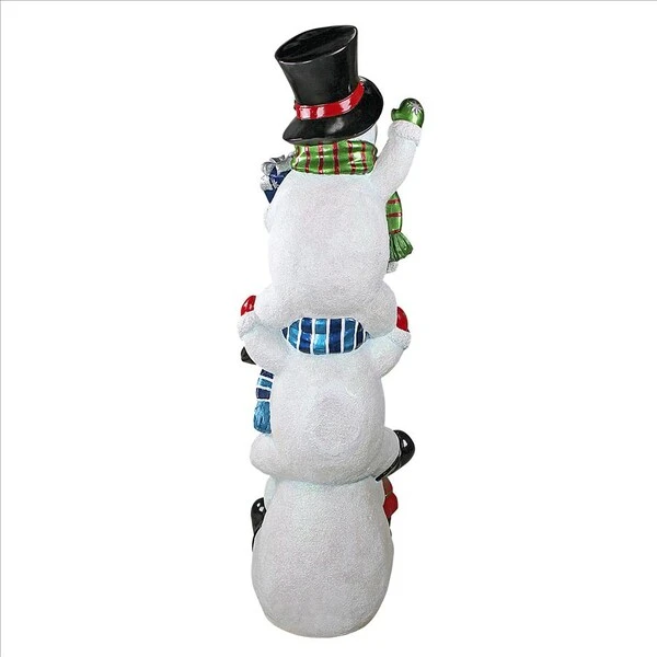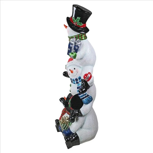 Light up the season indoors or out with this four-foot holiday focal point glistening with dozens of twinkling LED lights! A dapper trio of frosty snowmen, each donning a cozy hat, gloves, mittens and scarf, waves a traditional greeting for a blizzard of winter fun. Our Design Toscano holiday statue is cast in quality designer resin and hand painted from adorable carrot noses to white snowball tummies. This large-scale, display-quality holiday sculpture transforms any home, garden, restaurant or hotel into something truly magnificent! These Christmas celebrants are connected with a 72″ cord for easy placement. Lights have a 10,000 hour life expectancy. 131⁄2″Wx15″Dx49″H. 30 lbs.