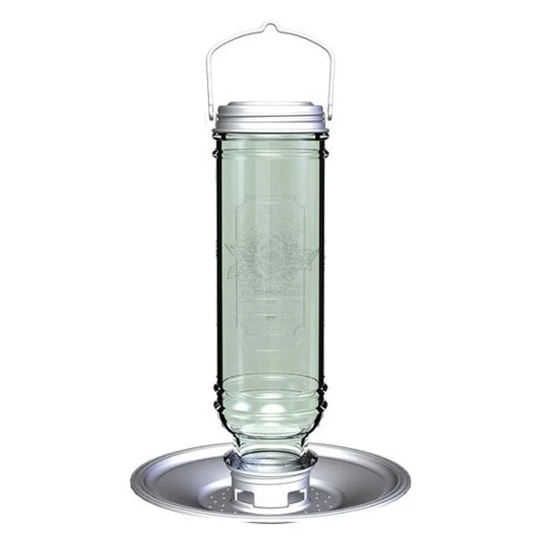 Beautiful new antique bottle and pewter metal accents, now in a seed feeder. Small port inserts convert feeder to a finch only feeder. Wide-mouth design offers easy fill which reduces or eliminates spillage. Easy clean feature: feeder disassembles to allow the user to quickly clean the feeder – bottle is dishwasher safe. Large perch allows for easy feeding. Holds 1.5 lbs of seed.Dimensions: Depth: 11.75Width: 8.28Length: 8.28