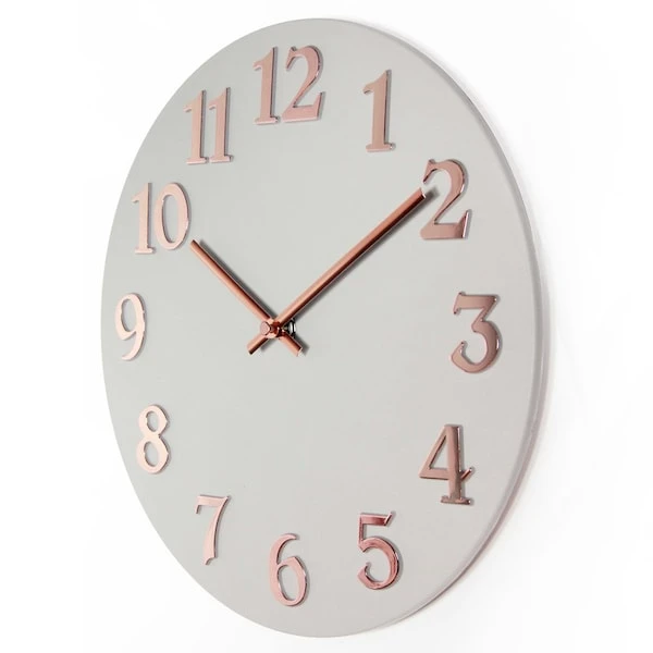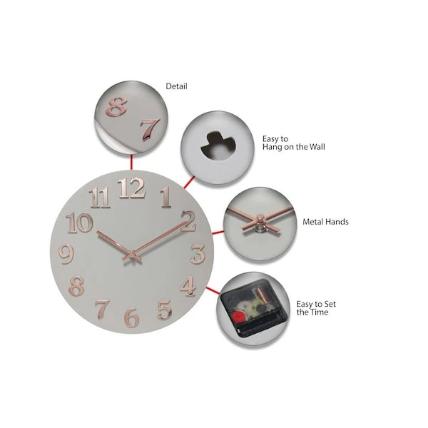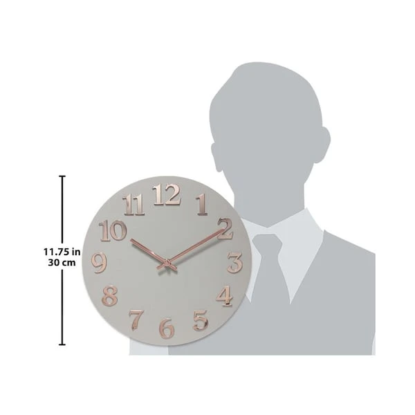 Instantly adorn your wall with our classic 12-inch round modern wall clock. The Vogue Gray & Rose Gold Wall Clock is beautifully decorated with metallic hands that stand against a matte-finished face, giving it that exotic and irresistible appearance. The Vogue wall clock is carefully crafted with large metallic numbers on a matte dial making it extremely easy to read. You no longer have to strain your eyes to tell time. Simplistic in design, yet effortlessly elegant to showcase its unique quality in your home. Our indoor clock boasts an impressive silent movement to ensure you enjoy a quiet and peaceful environment as you sleep or while you work. Packing an impressive design that compliments your home décor making it an ideal choice for bedrooms, study rooms, living rooms, family rooms, kitchen, classrooms, offices, meeting rooms, and dining rooms. Its style features an open face dial and no frame case design to create a contemporary atmosphere in your bedroom or dorm. With three color options, this clock is well suited for virtually any room décor. The new and improved Vogue wall clock comes with precise quartz movements to guarantee accurate time every day. Uses 1 AA Battery (Not Included)