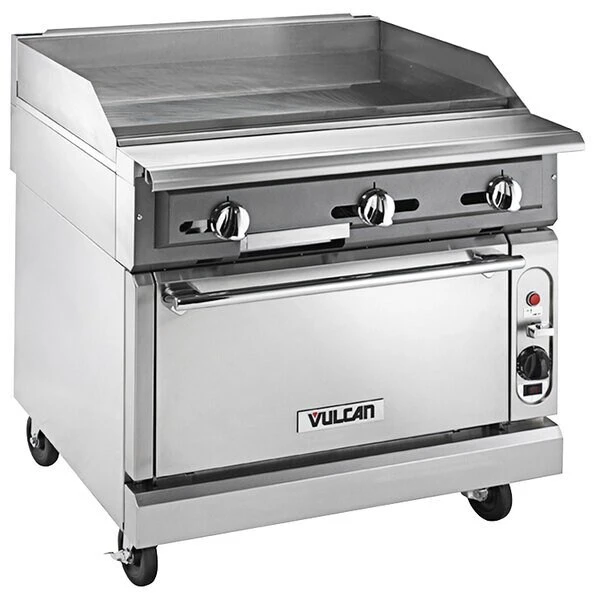 A great addition to your kitchen this Vulcan VGMT36S-LP 36in liquid propane heavy-duty thermostatic range w griddle top and standard oven provides consistent cooking! This heavy-duty unit boasts 3 burners w 30000 BTU of power each and 50000 BTU of power from its standard oven making it perfect for a variety of cooking needs. In addition each burner has its own snap action thermostat individual pilot and controls so you can customize your cooking process as desired. And for the chef who is looking for precise temperature control the thermostatic controls allow you to set the temperature of the griddle top to suit the cooking requirements of different foods. Its 3/4in thick polished steel griddle plate heats evenly and will stand up to years of heavy use in your busy kitchen.Made of durable stainless steel this two-in-one griddle top and standard oven provides optimal performance in one unit. The standard oven boasts a temperature range of 150-550 degrees Fahrenheit and a 27inX27inX13in oven cavity for versatile cooking. It also includes one rack capable of three positions to allow you to comfortably place casseroles roasts and more properly in the oven. Plus the base oven sits on 6in adjustable stainless steel legs to create the perfect working height while making it easy to clean underneath for a safe sanitary kitchen!Designed w flexibility in mind this range easily banks w other similar units so you can create the perfect layout in your kitchen. The front gas manifold and capped rear gas connection provide a hassle-free convenient gas connection that allows units to be placed side by side. This unit requires liquid propane for operation.Overall Dimensions:Left to Right: 36inFront to Back: 41 7/8inHeight: 40 1/2inCooking Surface Dimensions:Left to Right: 36inFront to Back: 23 5/16inInterior Dimensions:Left to Right: 27inFront to Back: 27inHeight: 13in