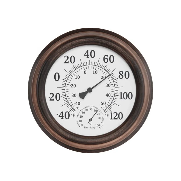 The Wall Thermometer is a necessity for any home! This convenient piece measures both temperature and humidity and is great to have in all seasons. With a sleek bronze finish, this clock-style hanging thermometer is a wonderful addition to any area of the home, indoors or outside; hang it on your patio, porch, deck, kitchen, or sunroom. Equipped with a 5.5-in display face, you can easily read the temperature at glance, while the sturdy steel construction ensures that the gauge will survive any weather conditions. It’s an attractive and functional piece for your home!