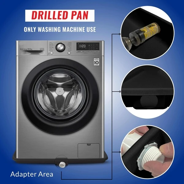 This version has hole in rear pan wall already. Also avail in undrilled version. Made of durable high density polyethylene HDPE plastic so won’t crush or crack like cheaper styrene pans. Provides lasting protection from washing machine overflow or hose failure. PreDrilled Drain Adapter Hole. Includes 1″ PVC drain hose adapter with hardware. ID dimensions inside at bottom of pan 30 in x 28 in x 1.75 in high. Outside dimensions 32 x 32 in